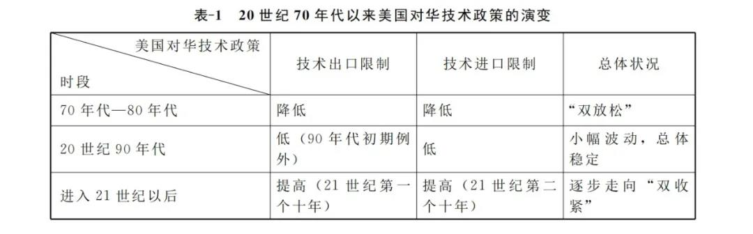 技术具有二重性,技术进步既可以服务于国家经济发展,也可以巩固国家安全地位。因此,对外技术政策成为大国竞争的重要内容。自20世纪70年代以来,美国对华技术政策大体可分为三个阶段。20世纪70年代和80年代是第一阶段。在这一时期,美国逐步放宽了对华技术进出口限制,因此,该时期是“双放松”时期。20世纪90年代,美国对华技术政策进入第二阶段,在这一时期,美国对华技术政策出现短暂、小幅波动。尽管如此,美国大体延续了此前的“双放松”政策,对华技术进出口限制并没有随着冷战结束而收紧。到了21世纪,美国对华技术政策进入第三阶段。尤其是唐纳德·特朗普当选总统以后,美国对华技术政策出现大幅调整。此时,美国政府不仅加强了对华技术出口限制,还加强了对华技术进口限制,呈现“双收紧”趋势。如表1所示,在不同历史时段,美国对华技术进口与出口限制呈现较大差异,从“双放松”逐步走向“双收紧”。那么,为何美国对华技术政策会呈现出这一变迁?