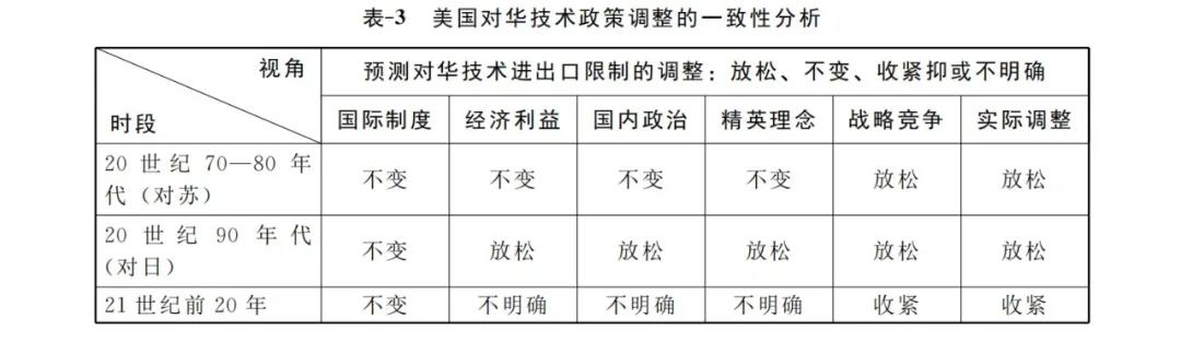 一般而言,领导国往往会双管齐下,同时采用技术出口限制与技术进口限制,但是,面临不同类型的战略竞争压力,领导国对外技术政策的重点会有所不同。在面临军事竞争时,它更多倚重技术出口限制。而在面临经济竞争时,则更多选择技术进口限制。在限制竞争者的同时,它往往会加大对合作伙伴的技术支持,以增强盟友实力,巩固伙伴关系,共同应对竞争者挑战。因此,在强化对竞争者的技术进出口限制的同时,领导国会相应放松对合作伙伴的技术进出口限制。也就是说,领导国对竞争者与合作者的技术政策调整往往是“一枚硬币的两面”,对竞争者收紧与对合作者放松往往是同时进行的。20世纪70年代以来美国对华技术政策的调整和上述逻辑是吻合的。如表2所示。